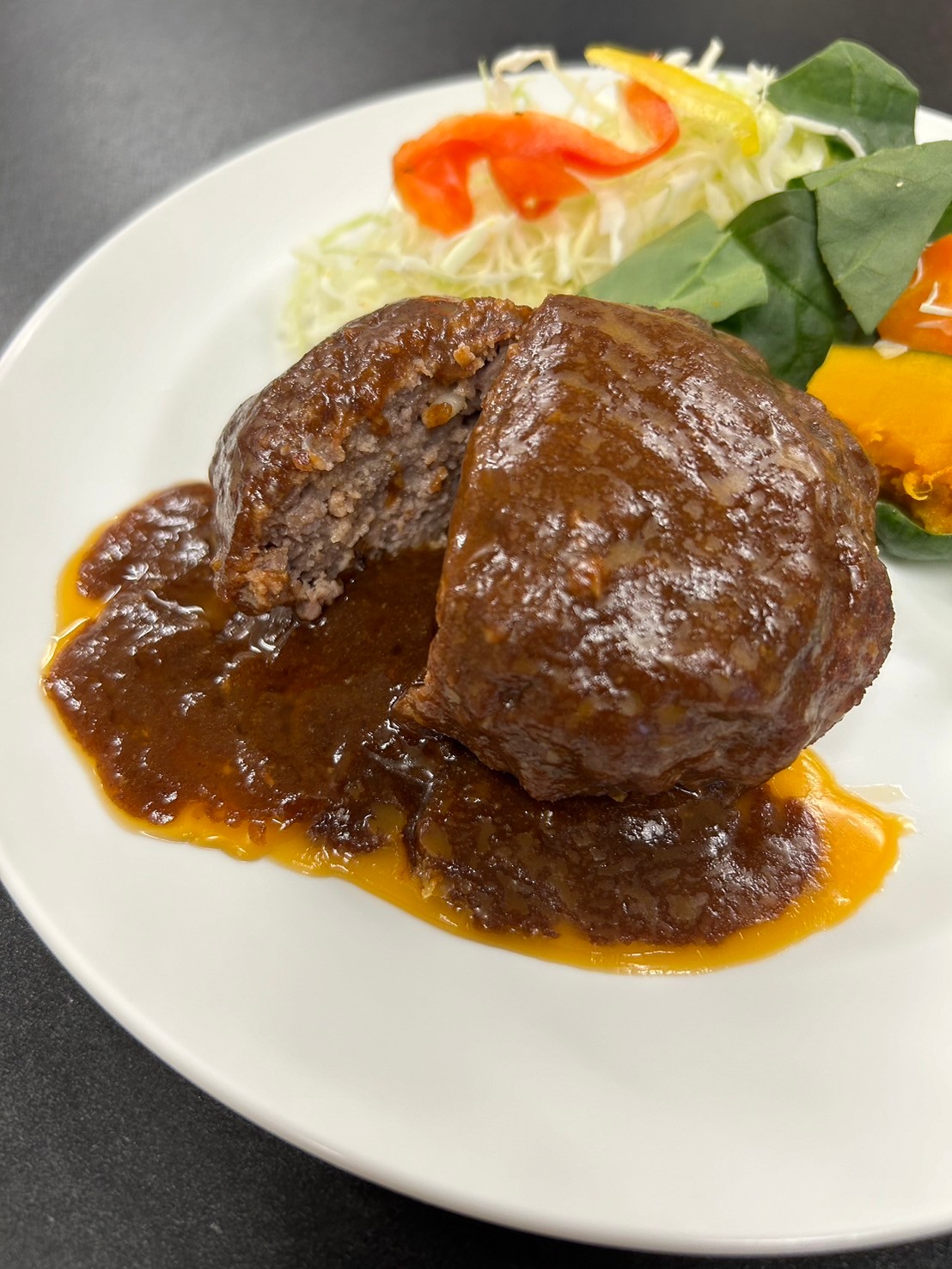 • 食べ応え抜群の和牛100%ハンバーグ。