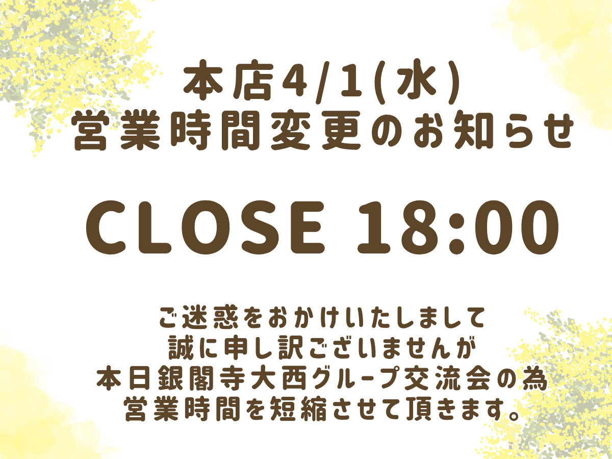 本日4月1日、社内グループ交流会開催のため、銀閣寺大西 本店の営業時間を変更させていただきます。